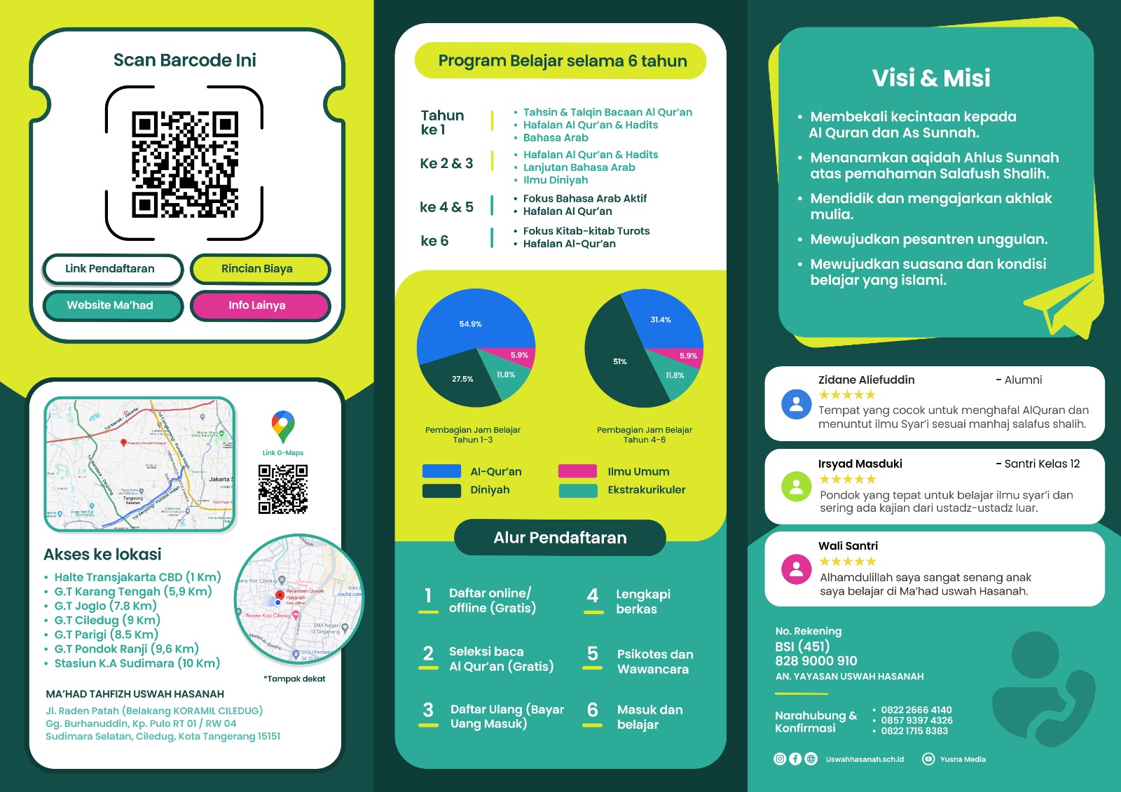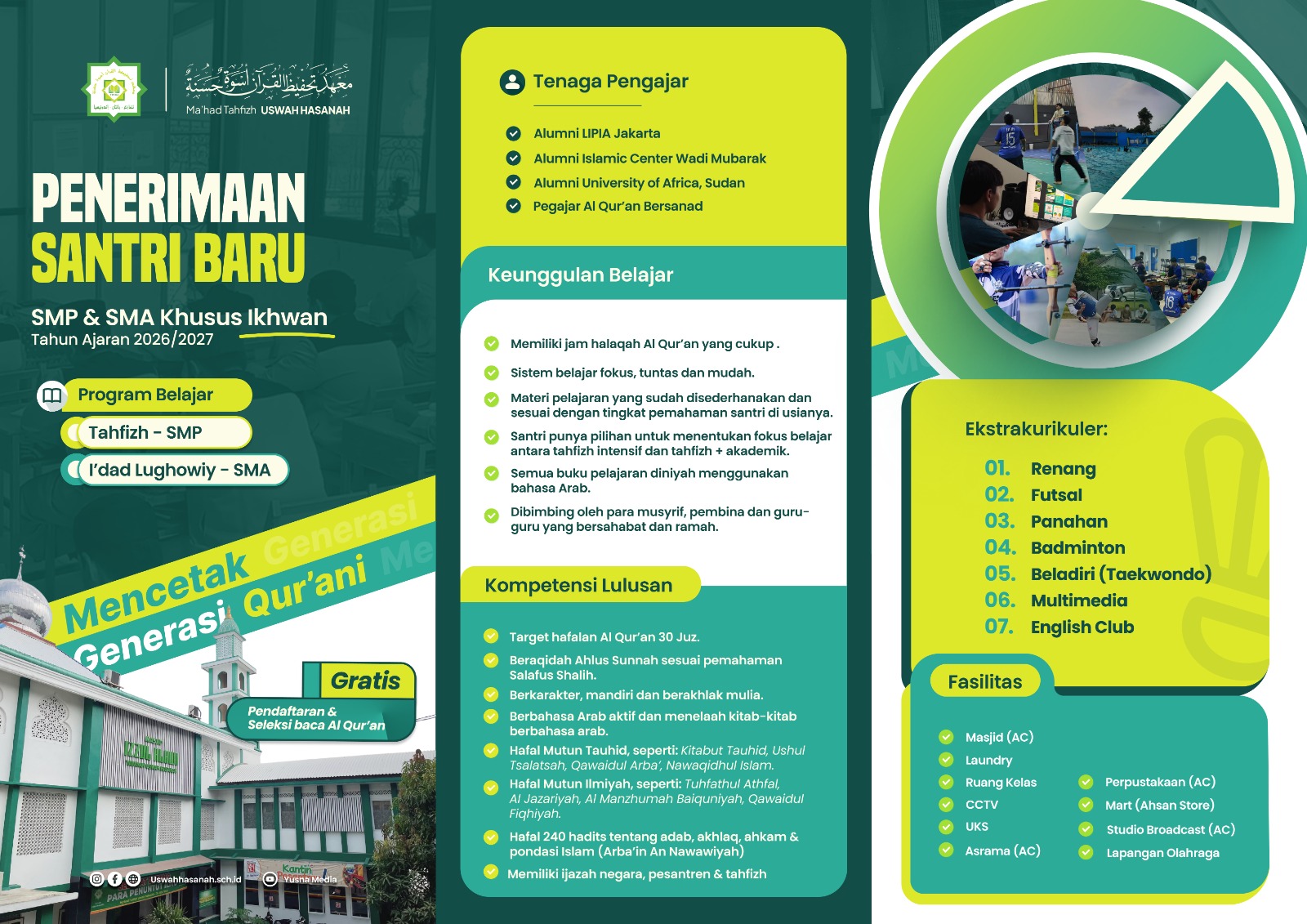 Ma’had Tahfizh Uswah Hasanah merupakan lembaga yang berupaya melahirkan generasi muslim yang berkualitas, bertaqwa, berakhlak mulia dan mandiri. serta bermanfaat bagi umat dan masyarakat. Dengan sistem pembelajaran bahasa arab, diharapkan anak didik mampu untuk mempelajari agama Islam langsung dari literatur-literatur berbahasa arab yang sesuai dengan Al-Qur’an dan As-Sunnah menurut pemahaman Salafusshalih (pendahulu yang shalih) umat ini.